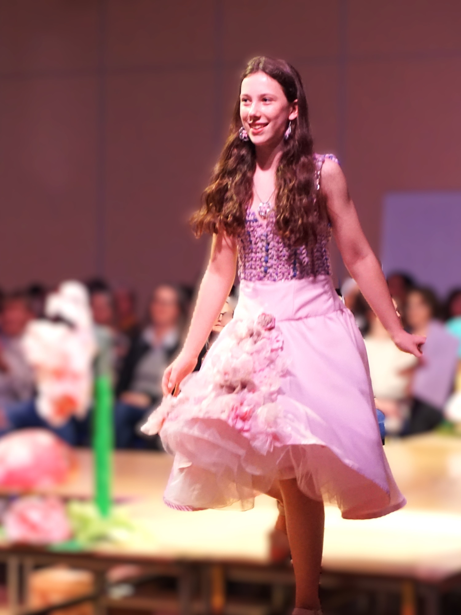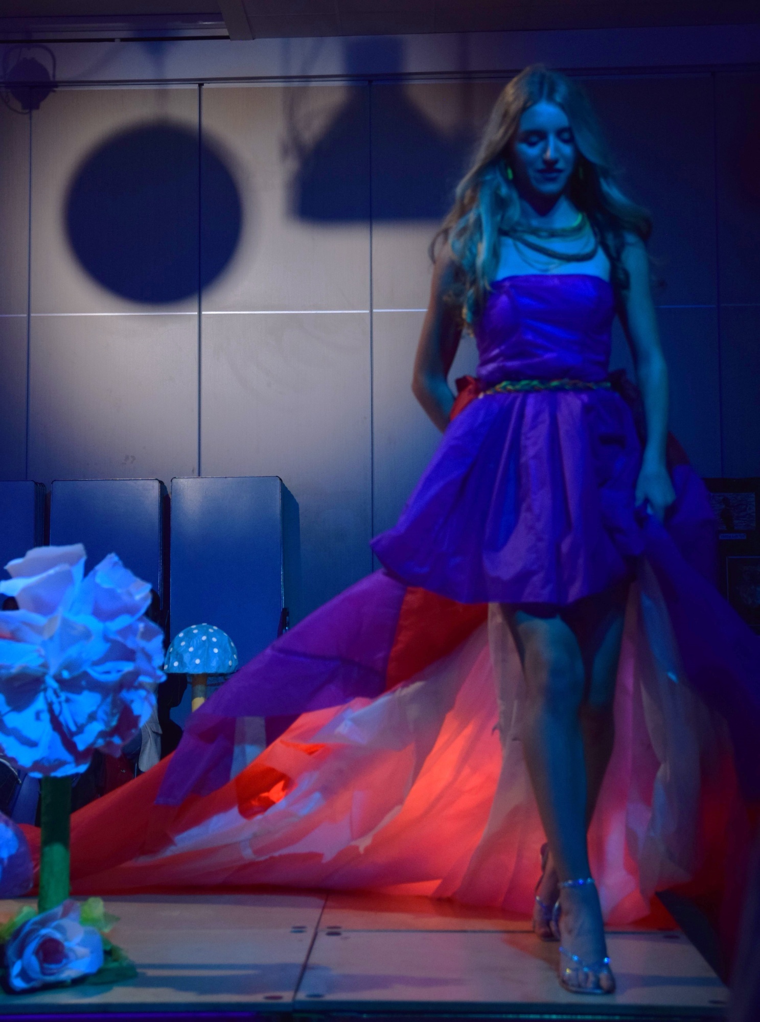Driven by the vision of Mrs Finch, who is Ribston Hall’s Curriculum Lead for Design, the Sustainable Fashion Show became a vibrant showcase of eco-conscious creativity. Mrs Finch’s commitment to sustainable fashion offered students a unique platform to explore their artistic potential, encouraging them to design with purpose and confidence. Student creators experimented with aspects of fashion like runway presentation, costuming, and art textiles. There was an “ethereal” feel to the evening, which created a magical atmosphere, with teachers and students transforming the space into a secret garden adorned with mushroom-inspired decorations.
