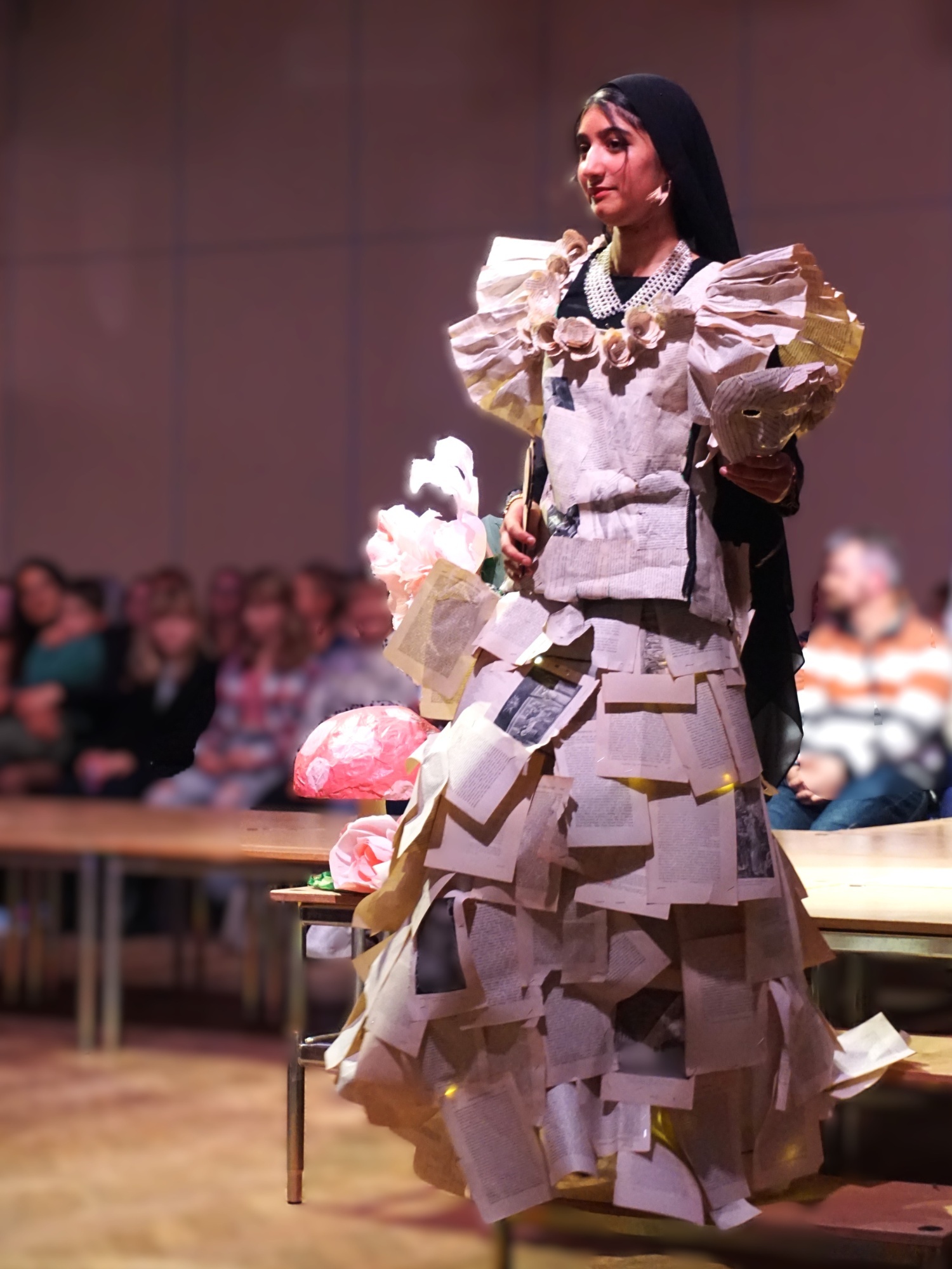 Ribston’s textiles students crafted their designs from upcycled fabrics and repurposed materials. Each outfit was a unique expression of sustainable fashion, embodying the students' commitment to creativity and environmental responsibility. One of the standout pieces of the night—and the winning design—was a breathtaking dress made from a repurposed parachute by Neve McAusland, modelled by Eva Nunez, which captured the audience's attention and epitomised the eco-friendly spirit of the event.